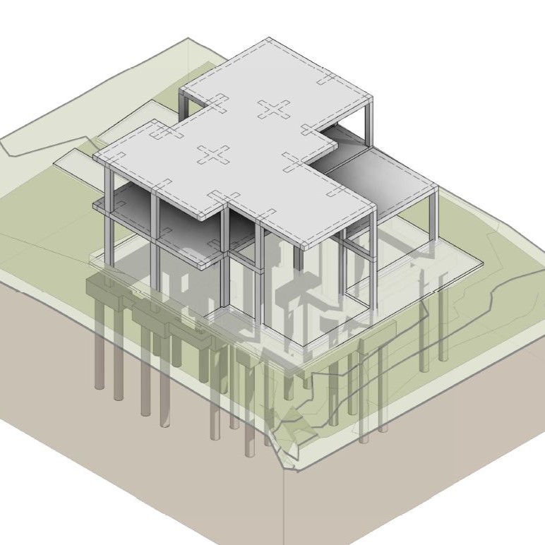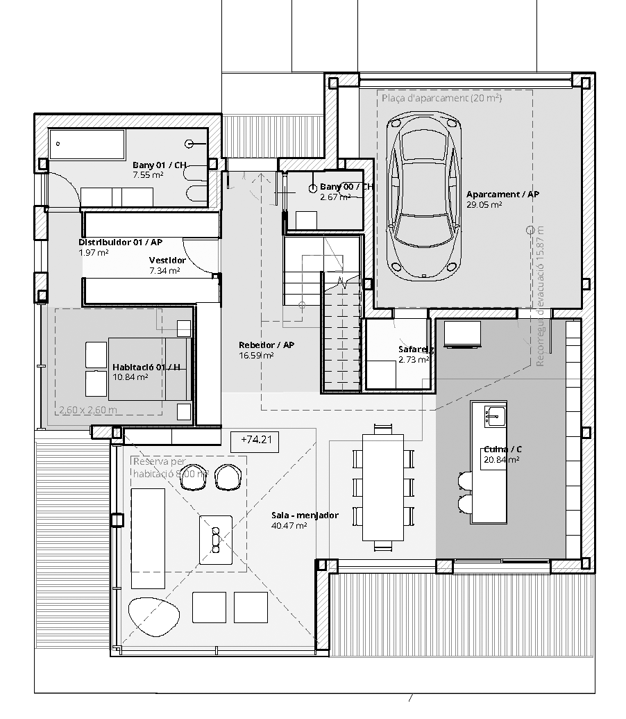 Es tracta d’un volum de 265 m² construïts. Es desenvolupa en dos nivells, amb accés principal per la part central de la planta baixa, on se situen el garatge, la cuina, la sala i el dormitori principal. A la planta primera es troba la resta d’habitacions i banys, amb una zona polivalent des de la qual es pot veure la doble alçada de la sala amb grans obertures per maximitzar els guanys energètics.